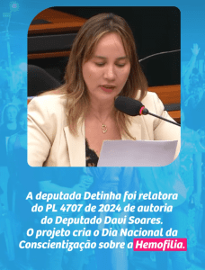 Tem novidade importante saindo da Comissão de Saúde da Câmara dos Deputados! A deputada federal Detinha foi relatora do Projeto de Lei 4707/2024, de autoria do deputado Davi Soares, que institui o Dia Nacional da Conscientização sobre a Hemofilia. Um passo gigante para dar mais voz, visibilidade e respeito a quem vive com essa condição de saúde.