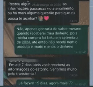 Em um dos casos relatados, uma cliente afirma ter feito uma compra em setembro de 2024 e, até o momento, não recebeu nem o produto, nem o reembolso prometido. As mensagens trocadas com o atendimento da empresa mostram atrasos sucessivos nas respostas e promessas não cumpridas.